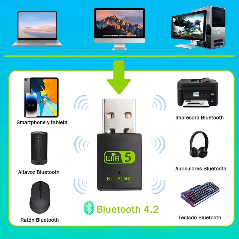 Bluetooth 4.2 permite que su PC sin Bluetooth se conecte de forma inalámbrica a dispositivos Bluetooth (teléfonos inteligentes, tabletas, altavoces, auriculares, teclados, ratones, impresoras, proyectores, etc.) para transmitir datos, editar o imprimir, con una distancia máxima de conexión de 10 m.