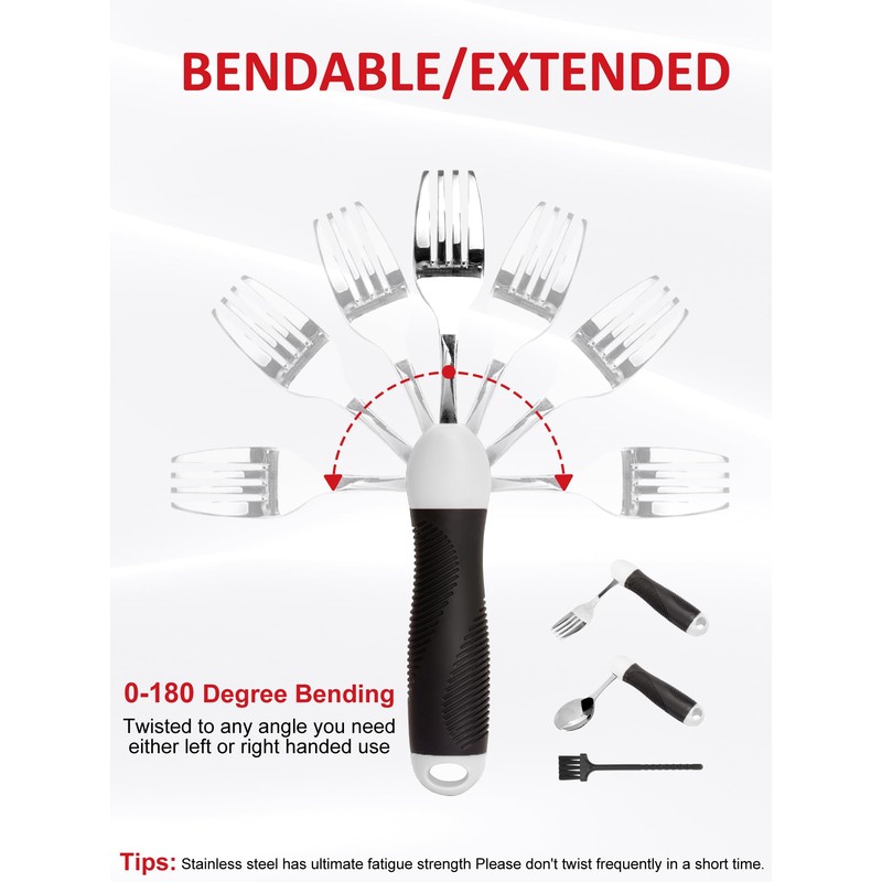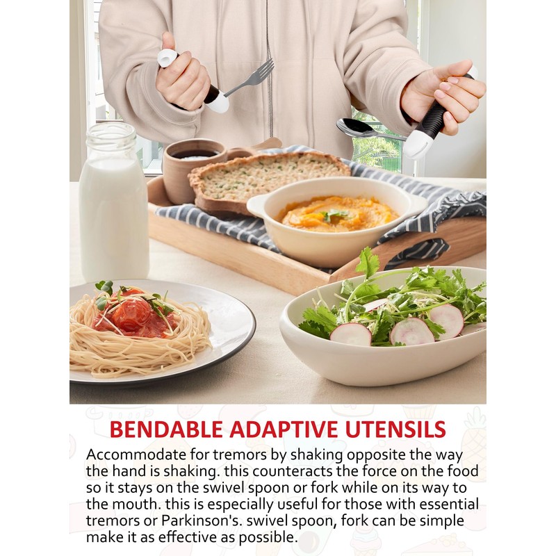 - 【Handicap Accessories For Daily Living】Bendable utensils, Can be bent at different angles for better reach. This is especially useful when the way the hand can come to the mouth isn't quite level with keeping the spoon upright or angled toward the mouth.