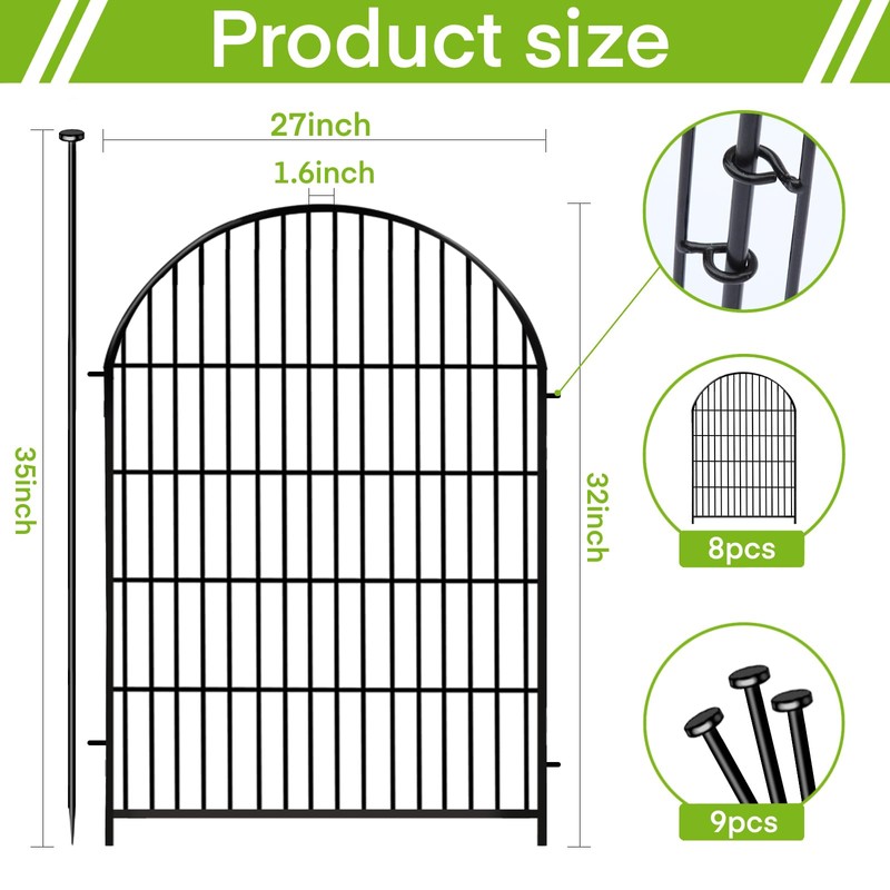 - Higher Fashion Fence: Classic Arched Design Garden Fence. Single Piece Height is 32 In, the Length is 27 In, Total Length for 8 Panels is 18 Ft. The Rod Gap is 1.6 In. The Item Include 7 Panels and 1 Gate, 9 In rod. This Garden Fence Wire is Welded by Thick Iron Wire, and with Black Rustproof Coating, very Strong and Well Durability. Compared with Traditional Fences, The Higher Height and Deep Installation to the Soil Make the Fence Enough Strong to Defense and Resist the Animals Attack, very Functional