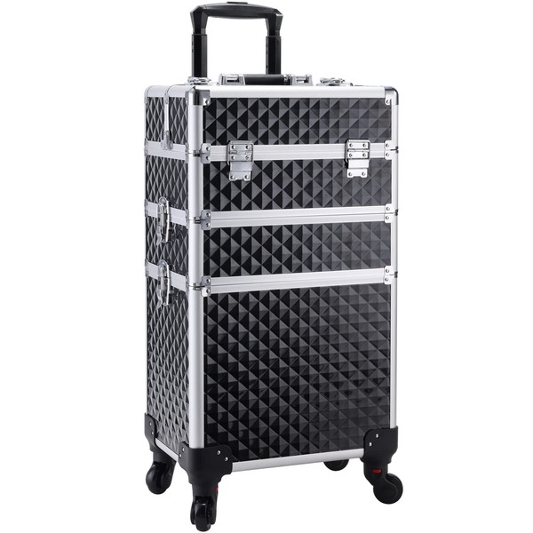 Adazzo 3 in 1 Professional Rolling Makeup Train Case Aluminum Trolley Case with 360° Rotation Wheels for Makuep Artist Cosmetic Suitcase Organizer with Lock and Key Diamond Pattern - Black
