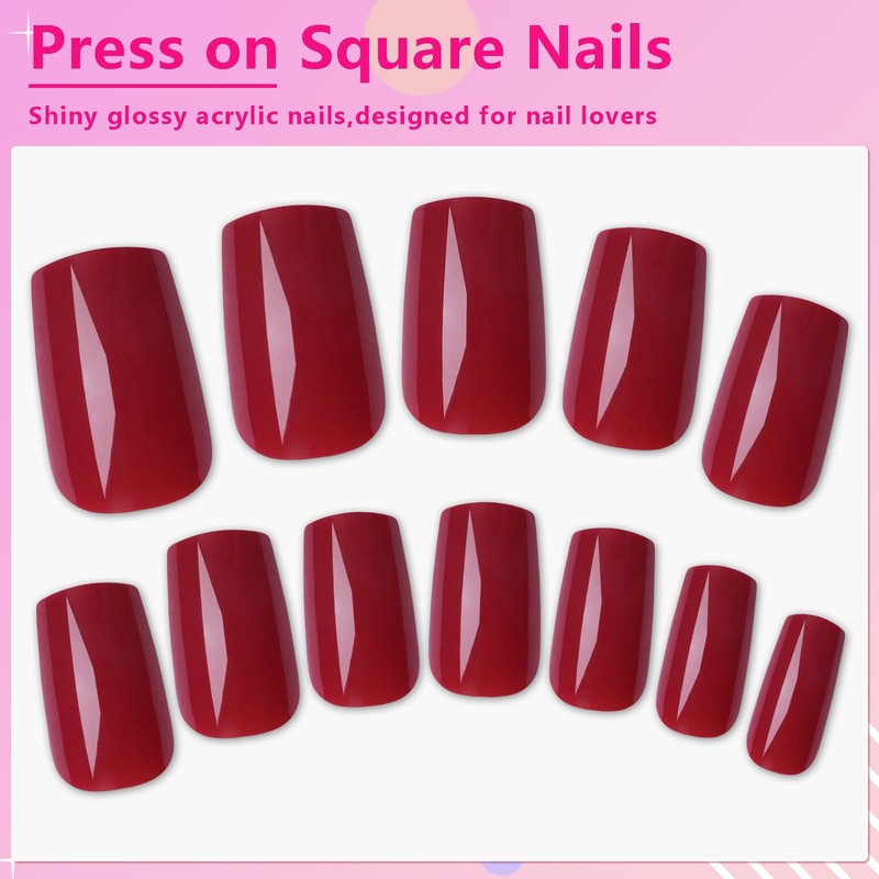 - Faster and Easier to Use: The red square press on nails set comes with glue adhesive tabs. Simply clean your nails, stick the nails on with adhesive tabs, and you're done! No filing, polishing, or drying is needed. Create beautiful, pre-shaped medium nail enhancements in just 10 minutes or less, saving you time and money
