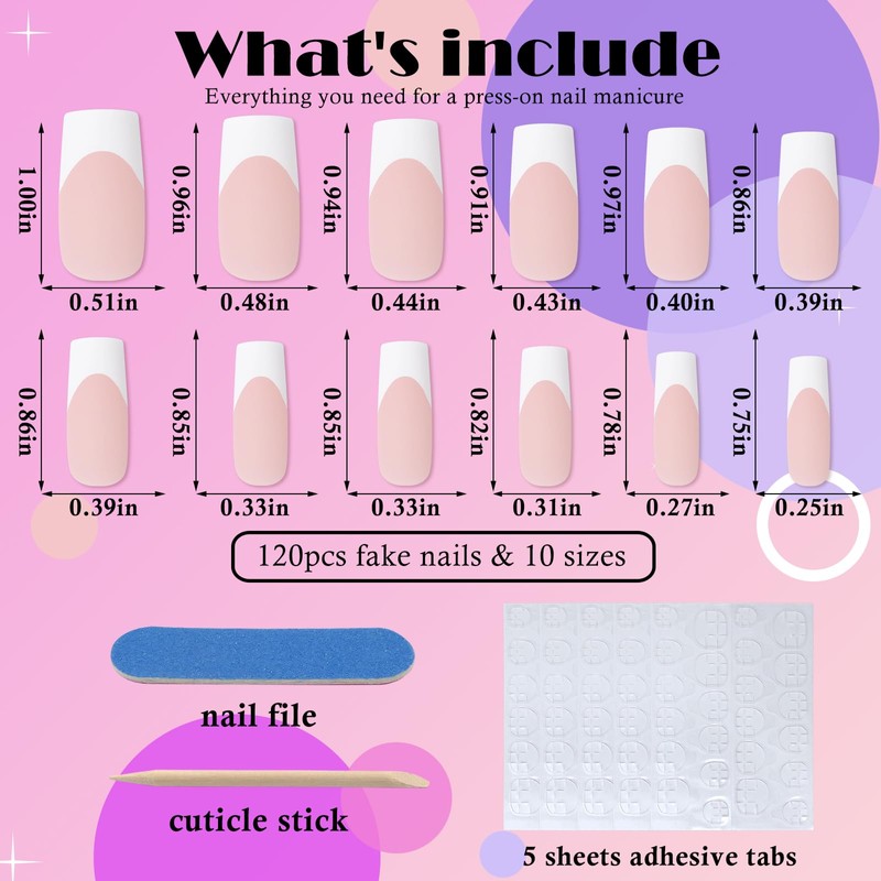 - French tips press on nails kit: content 120pc white french press on nails medium square shape, 5 sheets nail adhesive tabs, 1 mini file, 1 wooden stick. Medium press on nails square pack with everything you need for a press-on nail manicure, easy to achieve salon effect at home