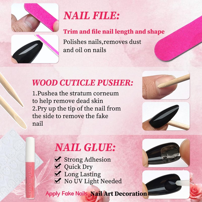 - Almond Press on Nails baby pink Kit: Included 240pc/box solid colored glossy baby pink press on nails medium length, 5 sheets adhesive sticky tabs, 1pc nail file tools and 1pc wooden stick, come with everything you need for a quickly DIY nail art manicure.