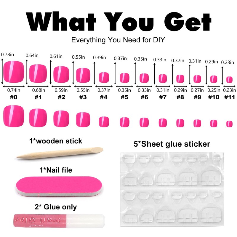 - Press on toenails kit: contains 240pcs/set dark pink press on toenails, 2*2g nail glue, 5 sheets adhesive nail tape, 1 nail file, 1 wooden stick. Full cover design, fit and good cover the shape of your own toe nails that make your toenail art looks more natural. This foot toe nail set are perfect for home toe nails manicure