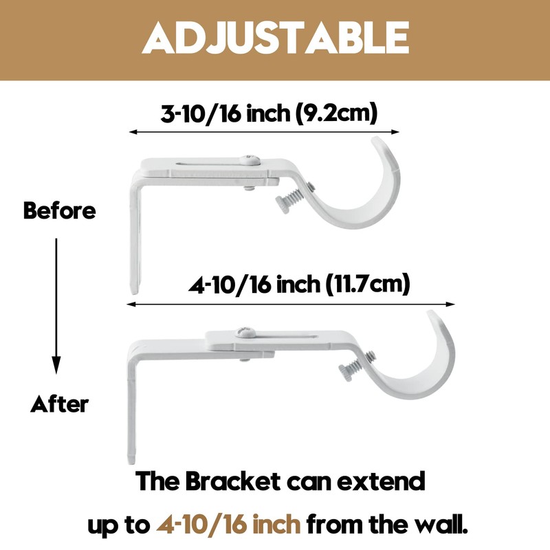 - ADJUSTABLE - The cup can hold 0.9-1.0 inch rod and the horizontal frame of adjustable curtain rod holder projecting 4-10/16 inches from the wall helps you to plan your room perfect.