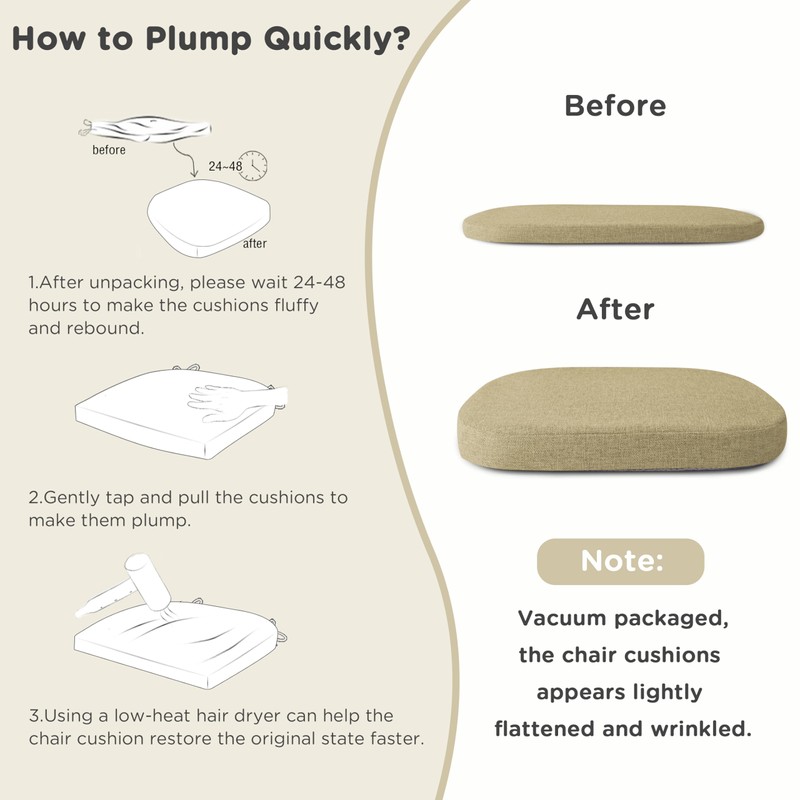 : Maintenance is a breeze – simply wipe down the cushions with a damp cloth and allow them to air dry. For an extra fluffy touch, press and tap them gently after unpacking to restore their original shape and comfort.Elevate your dining experience with the AddGrace Indoor Chair Cushions – where comfort meets style!