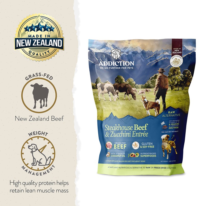 Addiction Steakhouse Beef & Zucchini Raw Alternative Dog Food - Gently Air-Dried Complete Meal or Dog Food Topper for Digestive and Skin and Coat Health, 2 lb