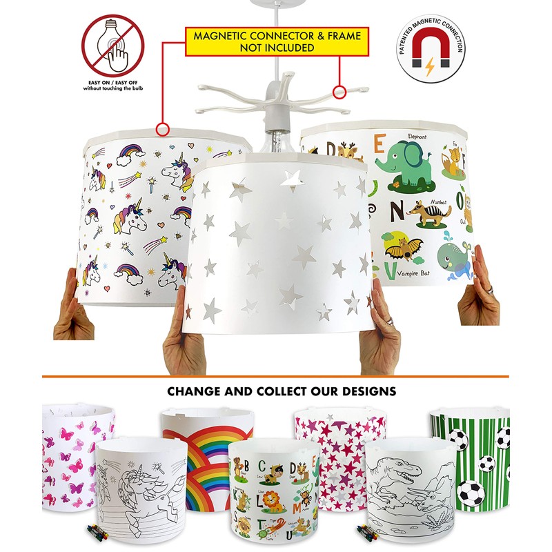 - QUICK AND EASY TO INSTALL: With the Ereki Magnetic connector installed over light pendant fixture, the simple on and off configuration allows for swapping and interchanging of our nursery light shades without removing the bulb; Rollable for easy transportation and safe storage.