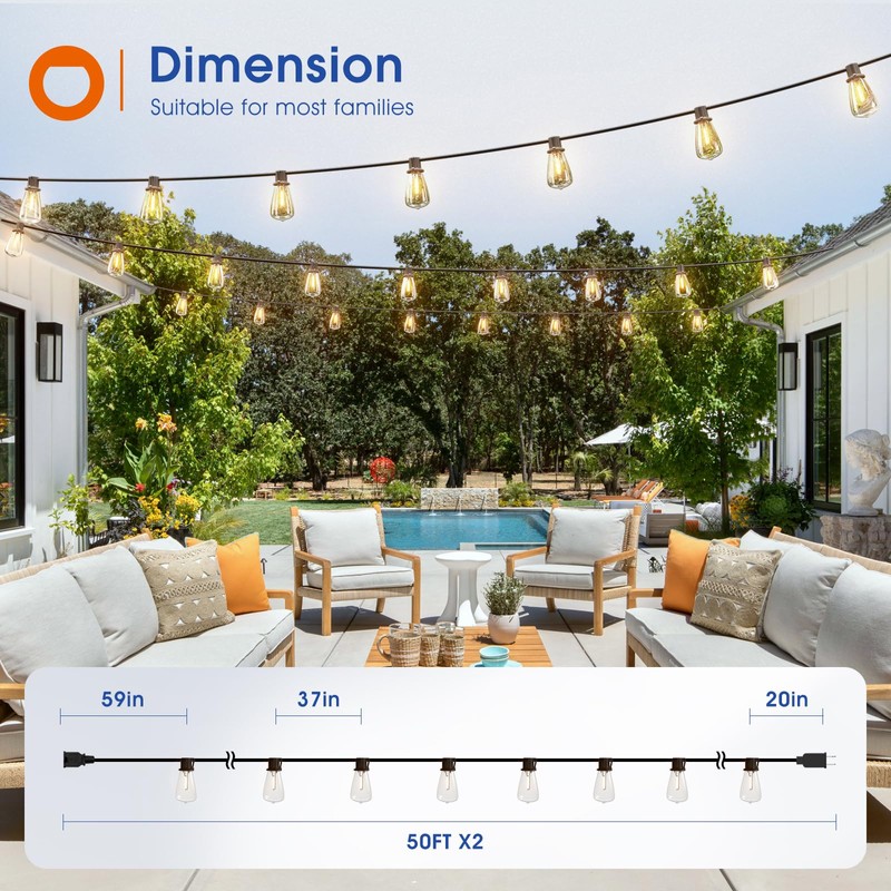 - 【Extend Your Ambiance 】 100FT (2x50FT) patio lights connect end-to-end. Link up to 28 strands of 50FT string lights for large-scale glow , no frequent length swaps. This is ideal for patios, backyards, bistros, gardens, gazebos, weddings, birthdays & more. Transform any occasion into a dazzling escape