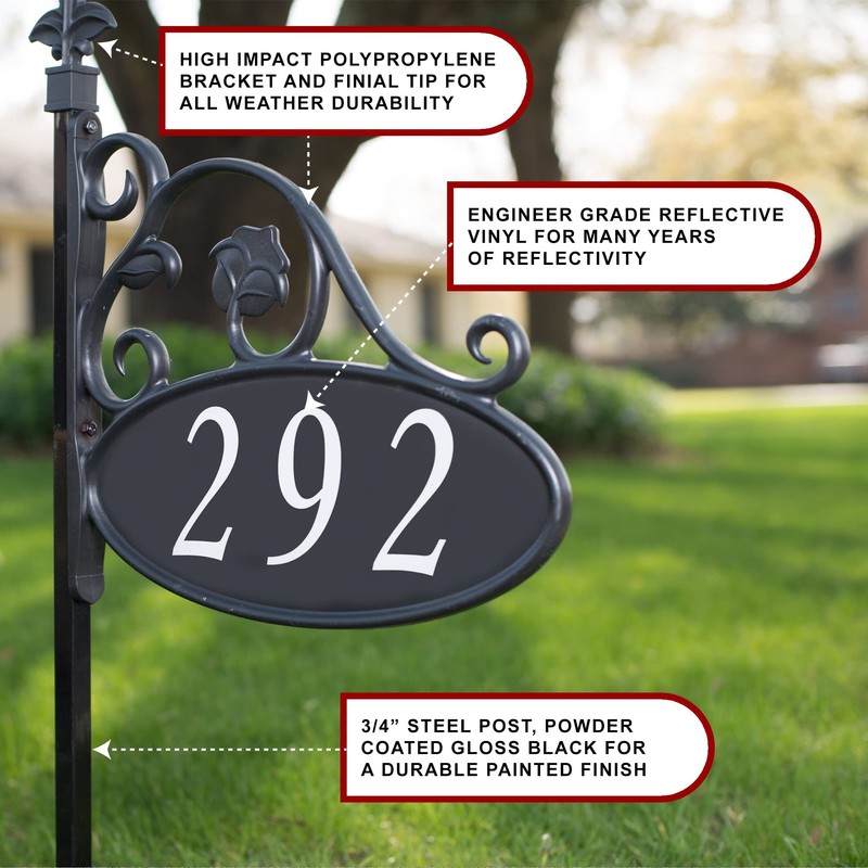 Address America USA Handcrafted Park Place Oval Reflective 911 Home Address Sign for Yard with Name Rider on Garden Flag Pole - Custom Made Address Plaque - Wrought Iron Look (58" Pole) - NP