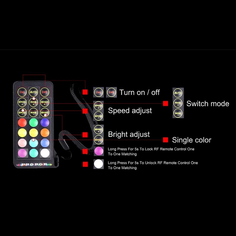 - The PRO remote has more functions, you can adjust the brightness, speed, color and mode, and also with the lock function, you can lock the light to be unaffected by other remote control of the same frequency. The metal remote control is more portable, it is smaller and lighter than the PRO remote control, and is simpler in function. 'A' is on, 'B' is off, and 'C' and 'D' are for switching modes. You can choose to use different remote controls according to your needs.