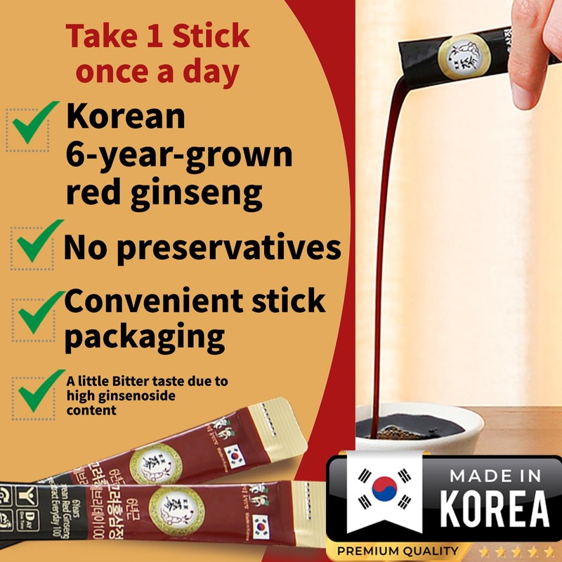 - One Stick a Day - Each stick pack contains the recommended Use (5.5mg/Gram) of Korean Red Ginseng Extract. It is individually packaged for easy consumption, and its portability makes it even easier to meet your recommended intake on the go.