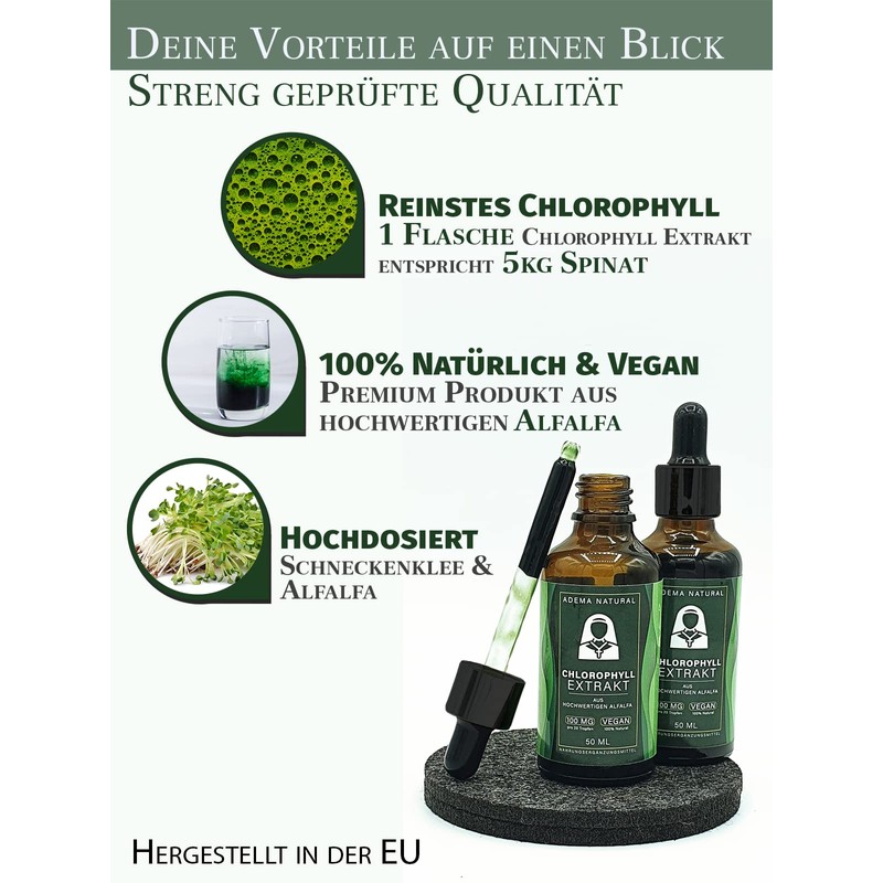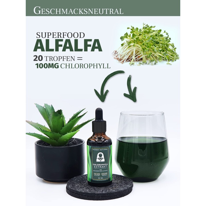 Adema Natural® - Chlorophyll Extract Drops - Extremely Green Liquid Liquid - Vegan - Natural and High Dose - Liquid Concentrate of Pure Alfalfa - 50 ml Content