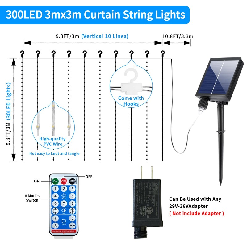 - 【Upgraded Solar Powered Curtain Lights】Adericher solar curtain light, 3m wide, 3m long, 10 strands of light beads, 30 LEDs per strand, a total of 300 LEDs, also with 10 stable hooks for easy assembly and hanging, use the latest upgraded high-quality transparent PVC cables instead of fragile copper wires, no entanglement, more durable and safer; upgraded solar panel and high-quality lamp beads, better waterproof performance and brighter brightness.