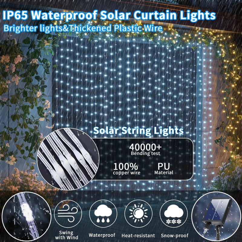 - 【IP65 Waterproof Curtain Fairy Lights】Adericher's solar panel and led curtain lights are both waterproof up to IP65, which is an ideal indoor and outdoor holiday decorative light, such as Christmas, Halloween, New Year, Easter, Valentine's Day, etc. Perfect for Wedding Party Window Gazebo Balcony Pergola Garden Yard Patio Backdrop Backyard Fence.