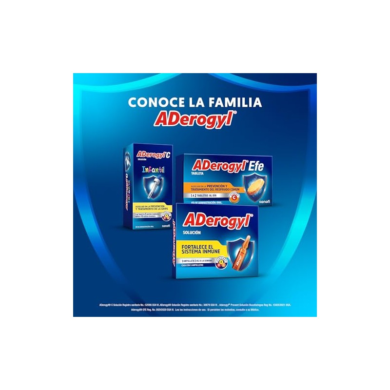 Aderogyl en Ampolletas, con Vitaminas A, C y D, Para el Sistema Inmunológico, Adecuado para Toda la Familia y Niños a partir de 12 años, 5 Ampolletas de 3 ml cada una.