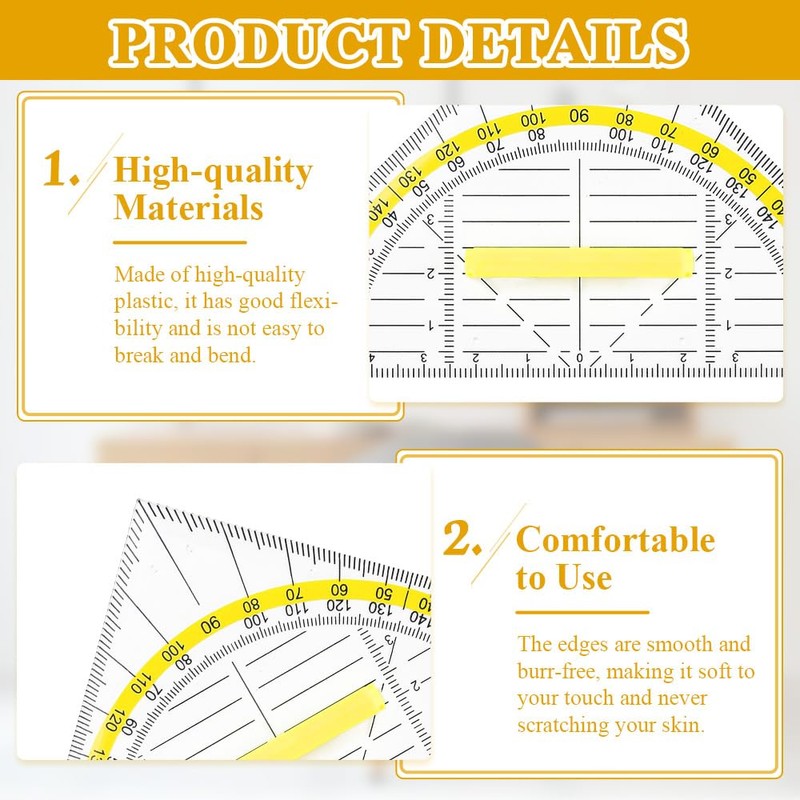 Equipped with clear measurement dimensions and angle markings, the left and right scales are clearly visible and the angle markings are accurate and precise, which can meet different precision measuring and drawing requirements.