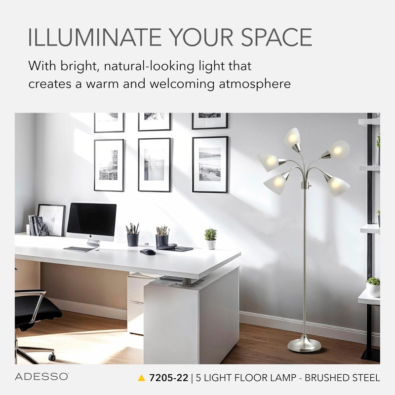 Adesso Floor Lamp with 5 Movable Shades & Adjustable Brightness – Perfect Lighting for Bedroom Decor, Beauty & Art Studio, Silver