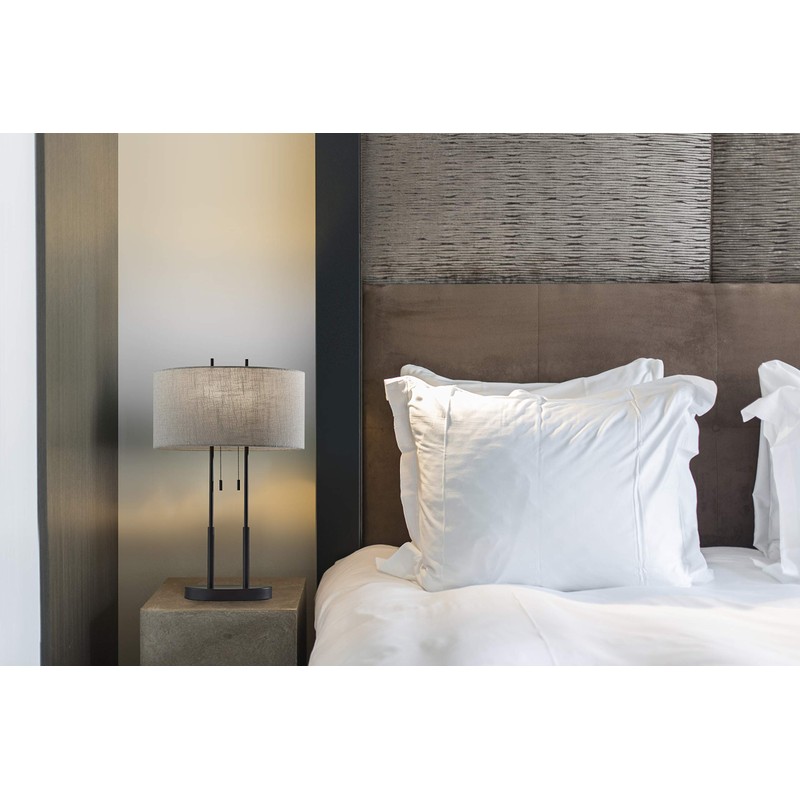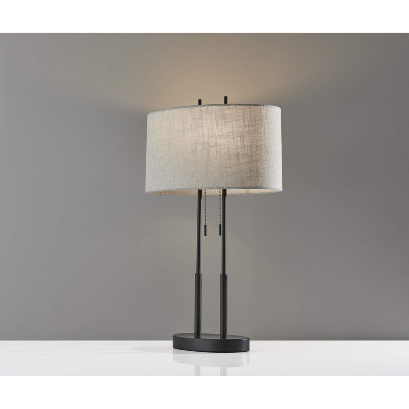 A classic pairing of bronze finishes and taupe textured fabric makes the Duet table lamp a perfect match for a modern farmhouse styled bedroom or living space. Two bronze poles each hold a socket, offering double the light, each operated by its own simple pull chain switch. The bronze finished finials create the illusion of continuous poles. Turn one light on for soft, mood- setting lighting or turn both on for a room-filling glow. Bulbs are not included.