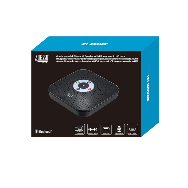 ADESSO Xtream S8 Conference Microphone Speaker: Bluetooth/Wired, USB 3.0 Hubs, AI Noise Reduction, 360° Voice Pickup - Optimal for Teams/Zoom Collaboration and Meeting Room Setup
