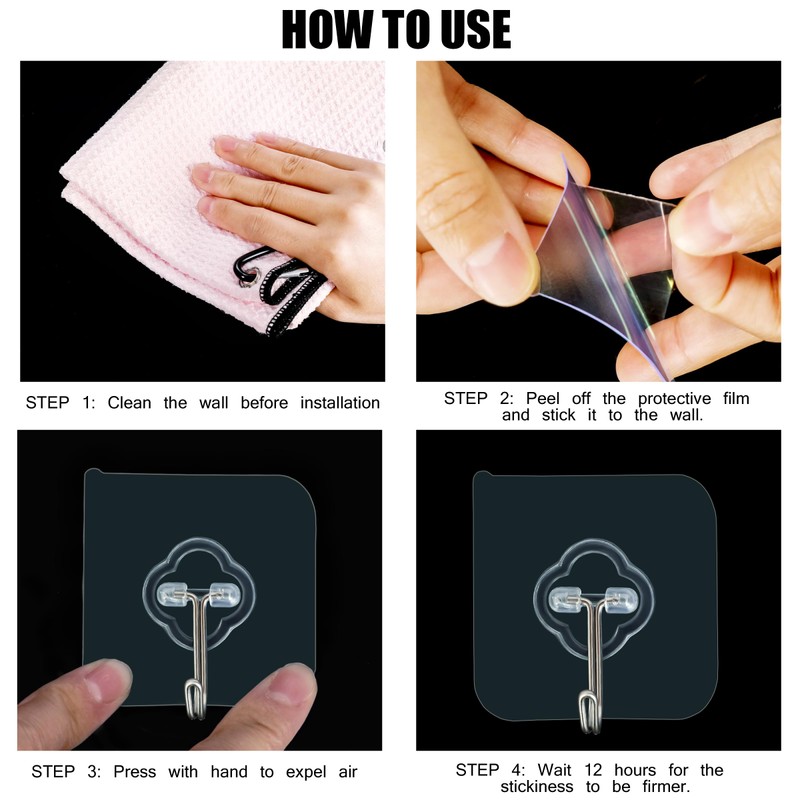 - High Load-bearing: First wipe the wall clean, tear off the protective film and stick adhesive hooks heavy duty on the wall, press with your hands to discharge the air bubbles inside.If you want to withstand overweight objects, you can wait for 12 hours before using the utility hooks, the effect is better, and the maximum weight can reach 33pounds,however, it is not recommended to load overweight items for a long time, especially expensive items.