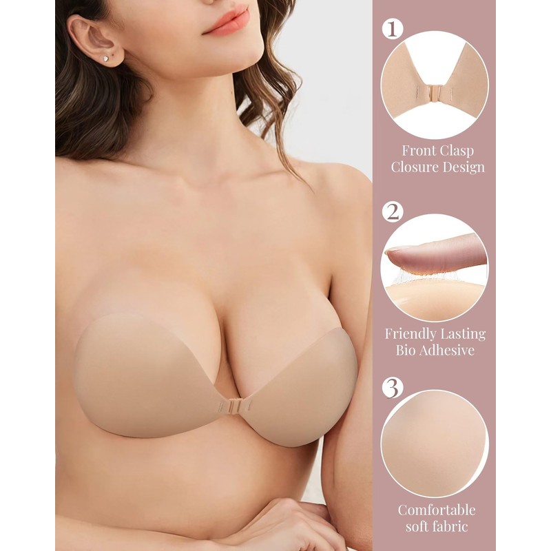 - Push Up & Invisible: Our stick on bra cups employ a clasp design at the front to secure and provide an ample cover. It assists in gathering, lifting and accentuating your breasts, crafting a visible and stunning V-shape while being discreet. It's a perfect backless strapless bra