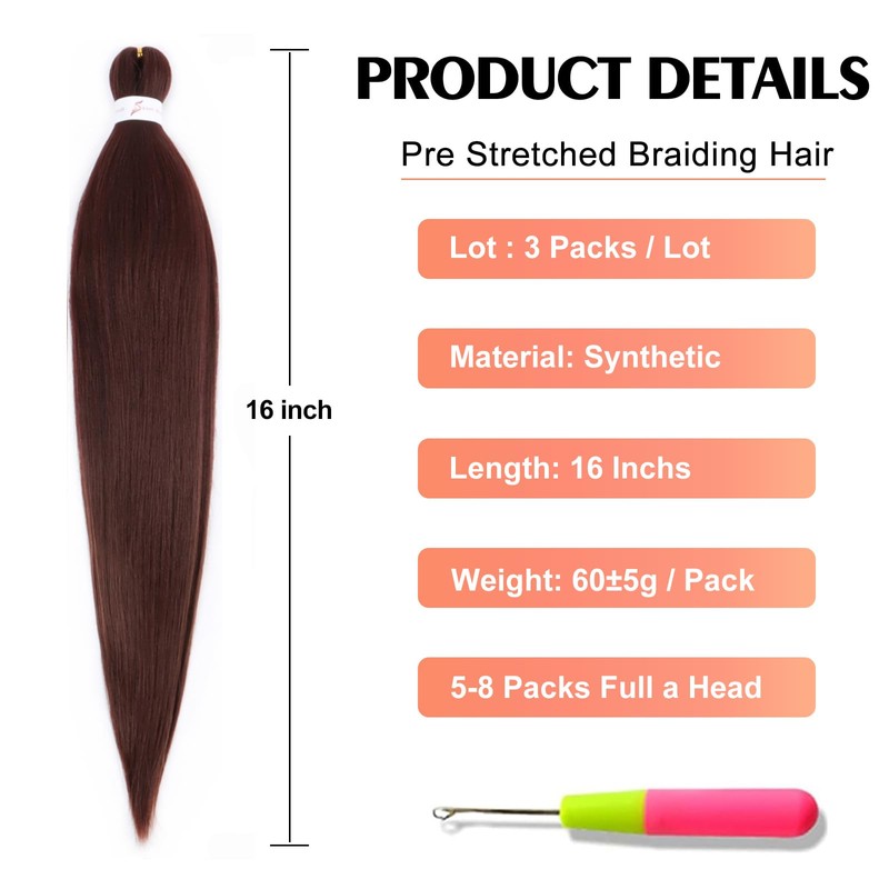 - Specifications: 3 Packs Pre stretched Braiding hair with crochet hook, 16 Inch(60±5g/Pack), Usually 6-8 Packs can full a head
