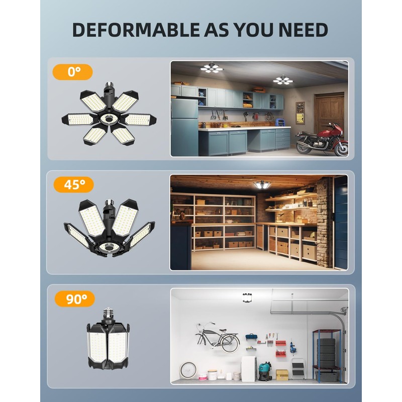 • 360° Adjustable Lighting Coverage: Equipped with six adjustable LED panels and rotatable bracket, this deformable garage light allows you to customize the lighting direction for optimal coverage. The unique foldable design ensures no dark corners, providing full illumination to your workspace. Whether you need focused task lighting or wide-angle coverage, this fixture adapts to your needs.