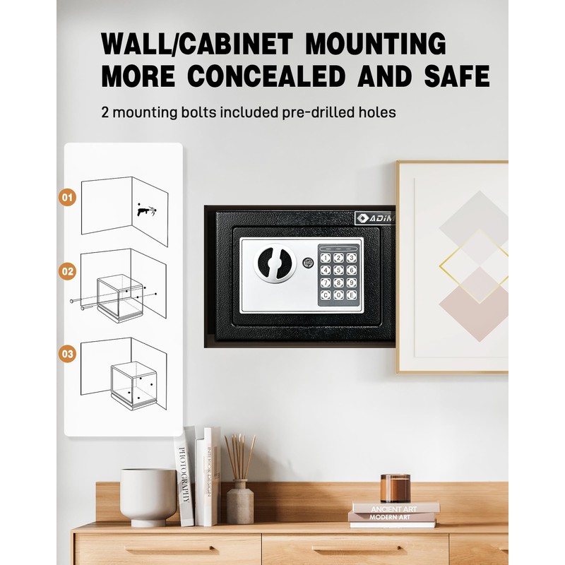 ADIMO Small Safe Box, 0.23Cubic Small Safe for College Dorm Room for Cash or Document, Money Safe with Keys & Passcode and Wall Safe Kits, Black Small Hidden Safe for Hotel Home Office Business