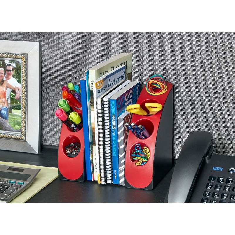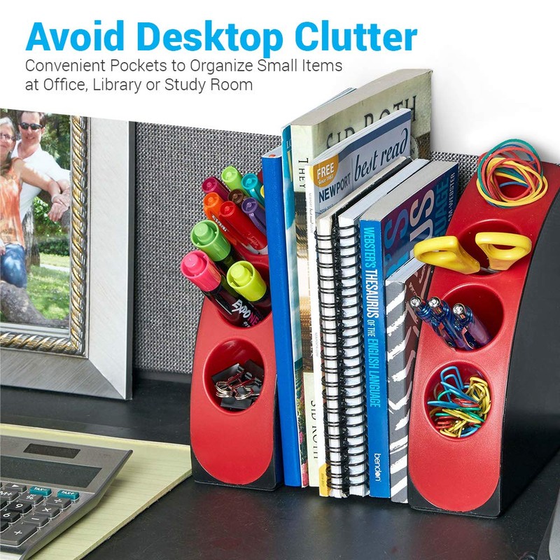 - Olas de almacenamiento generosas. Además de almacenar referencias de uso frecuente, cada sujetalibros cuenta con cuatro generosos pozos para artículos diversos. Utilízalos para sostener bolígrafos, lápices, clips de papel, bandas de goma, tachuelas, herramientas de cocina y mucho más.