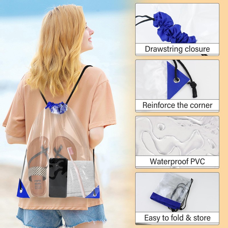 This transparent drawstring bag is made of PVC material. The interior space of the bag is spacious enough to accommodate mobile phones, wallets, water bottles, and other daily necessities. Its unique transparent design allows you to quickly pass through security checks when entering sports venues, concerts, and other venues, improving the convenience of travel. Whether you're attending a music festival, watching a competition, or going out on a daily basis, this transparent drawstring bag will be an indispensable travel companion for you.