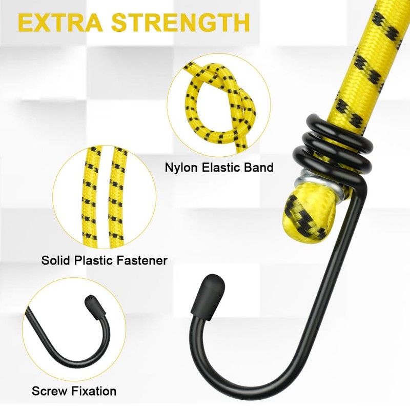 - Reliable: super strong load capacity of 35 kg, elastic straps with hooks help you tie and secure items with peace of mind. The flexible elastic bungee cable extends up to 2 times its size, making it perfect for securing items of any shape and size. The colour-coded design allows you to easily identify different cable lengths!