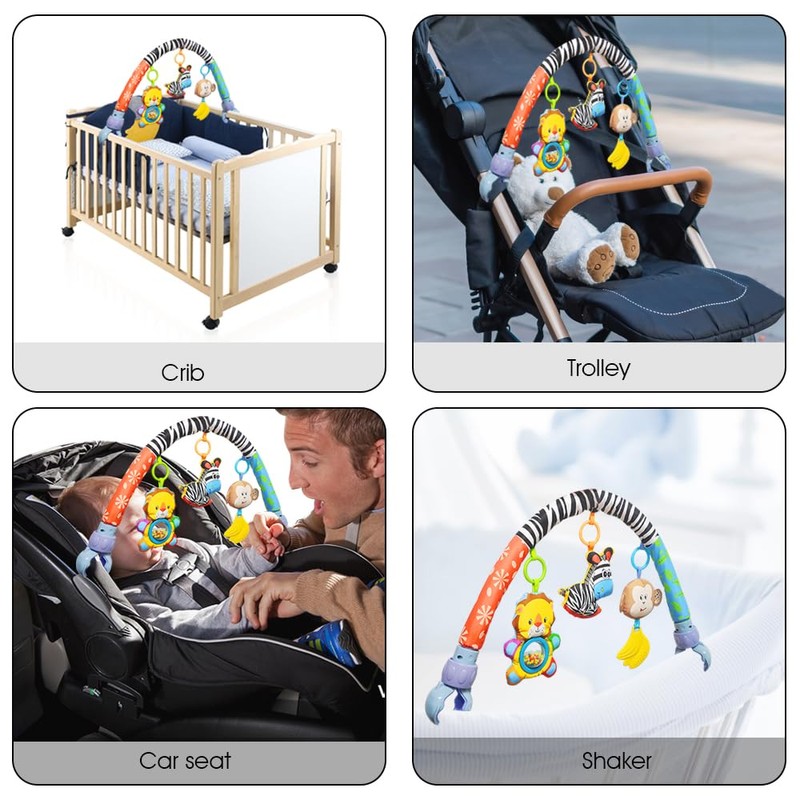 - ★ Cute & Colorful: The baby stroller arch toys are designed with rattle lion, bb squeaker zebra, musical monkey and teether, you can teach baby to recognize the bright color animals, develop their tactile senses, hand and eye coordination naturally.