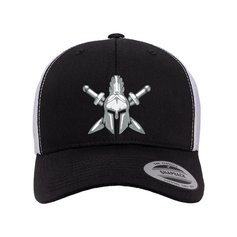 Adjustable Black/White Structured Trucker Spartan Warrior Helmet with Crossed Swords Structured Trucker Cap