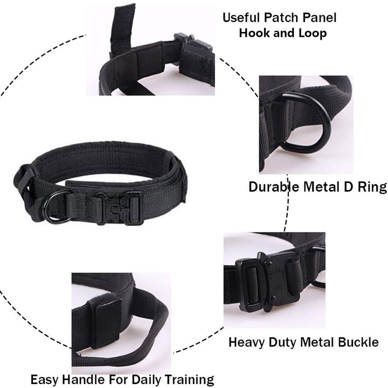1、DURABLE MATERIAL: Dog collar is made of premium polyester material, which is wear resistant and durable, not easy to damage and has a long service life. 2、EASY TO CONTROL: Pet collar comes with control handle, you can grab your dog from the collar. With D ring, you can control your dog with the leash. 3、METAL BUCKLE: Pet dog collar with metal buckle, strong and reliable, do not worry about the dog break free from the collar to escape. 4、ADJUSTABLE DESIGN: Metal buckle dog collar with hook and loop, you can adjust it according to the size of your dog, suitable for medium and large dogs. 5、APPLICABLE SCENARIOS: Adjustable dog collar is ideal for dog training, patrolling, hiking, working, walking, running and hunting.