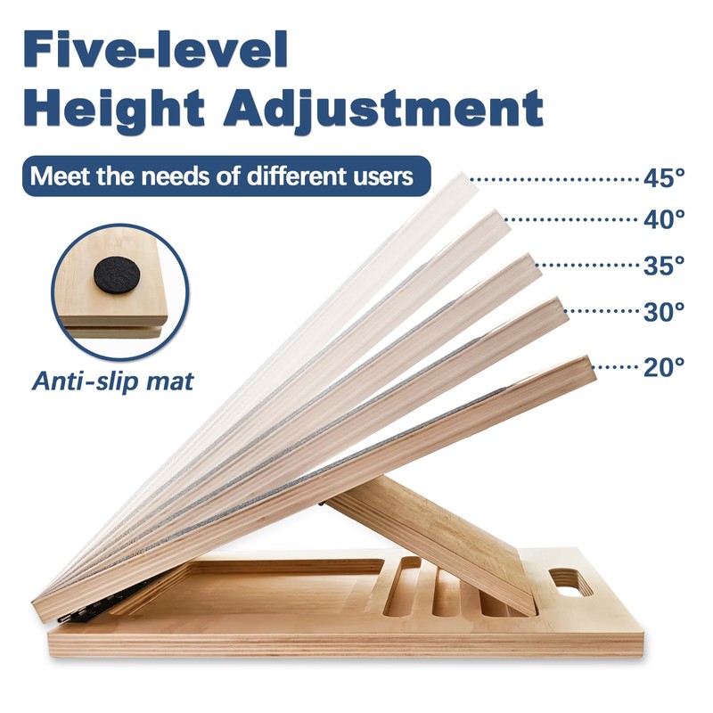 - 5 ADJUSTABLE ANGLES WOODEN SLANT BOARD: Engineered for maximum effectiveness, adjustable to 5 angles: 23°, 30°, 35°, 40°, 45°. You can choose different levels of calf stretching from easy to hard.Whether you’re targeting knees-over-toes mobility, calf stretching, or balance training, the secure block design allows for customized positioning, making it a must-have for sportsman, physical therapy, and squat training.