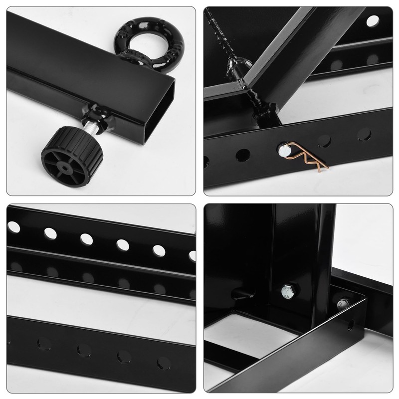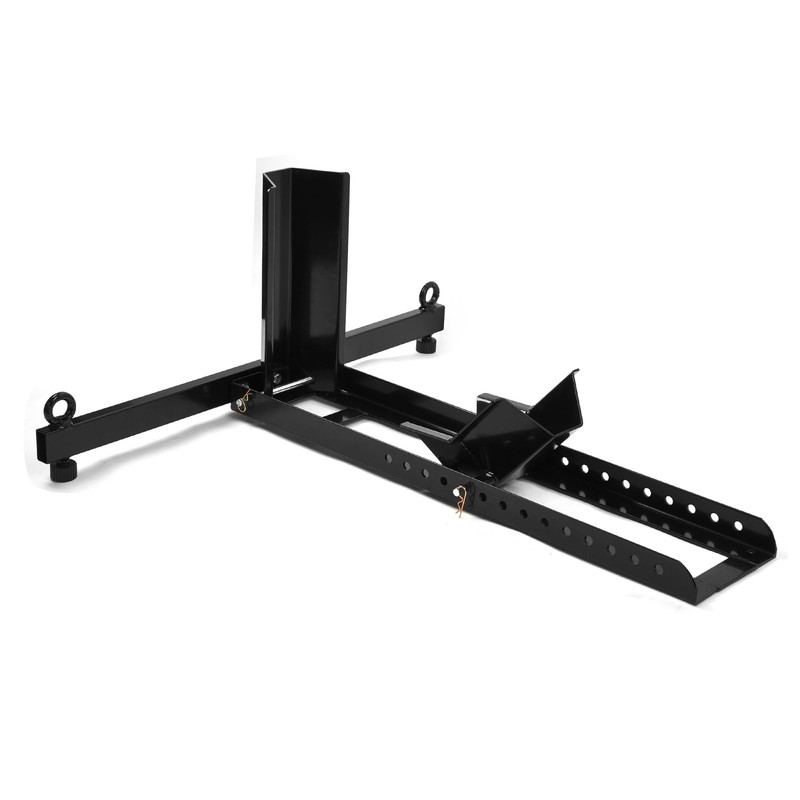 - It features two eye loops for straps and a tilting wheel adapter that automatically holds a tire securely.