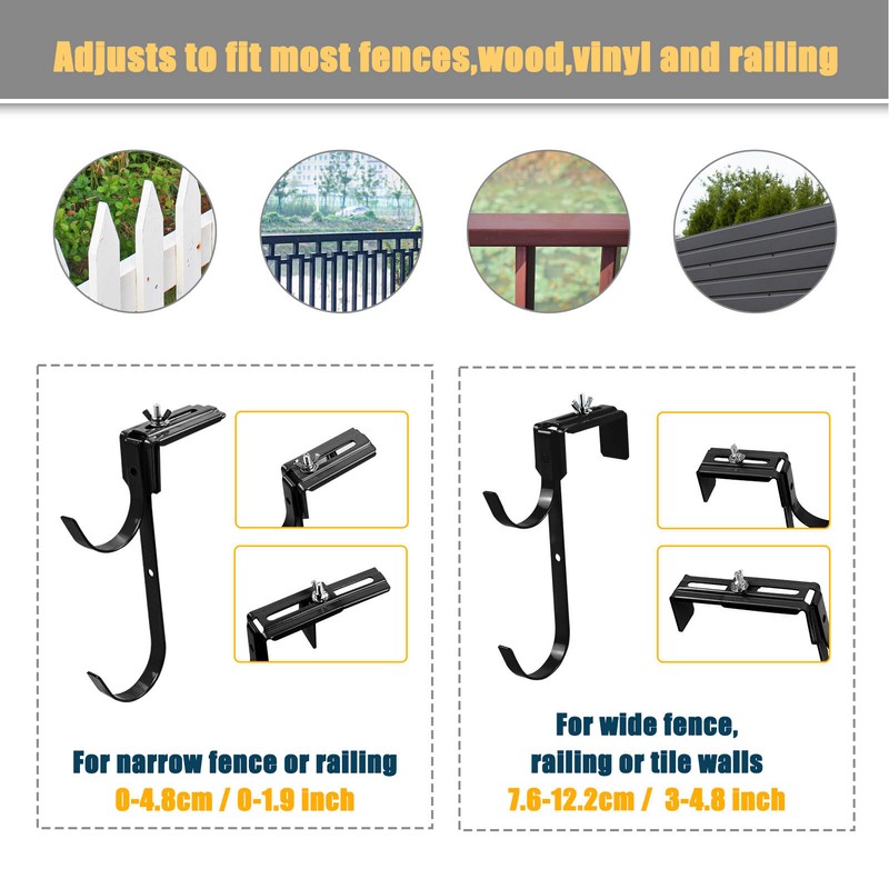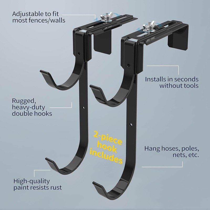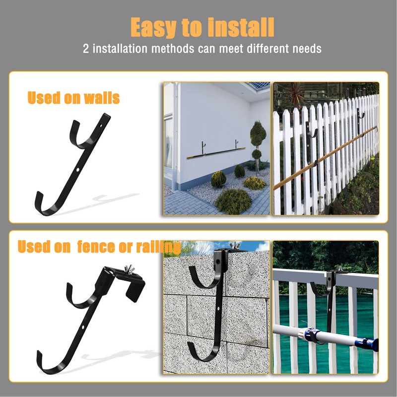 1、Scalable Design: Adjustable pool pole hooks are suitable for different lengths of swimming pool rods, making them convenient and flexible to use. 2、Strong Hooks: Swimming pool pole hook are load bearing and can be used to hang tools, equipment, etc., making it easy to store and use. 3、Durable Material: Metal pool pole hangers are made of irone material, durable and can be used for a long time, saving replacement costs. 4、Gardening Tools: Adjustable pool pole hangers can be used for gardening cleaning work, such as cleaning leaves, weeds, etc. 5、Fits Most Pool Fence: Adjustable pool pole hangers mount quickly and easily on fences, metal railings, wood fences, brick walls, metal posts, concrete block walls, chain link fence or anywhere else in your outdoor backyard where you need to organize and hang swimming pool cleaning equipment or garden tools.