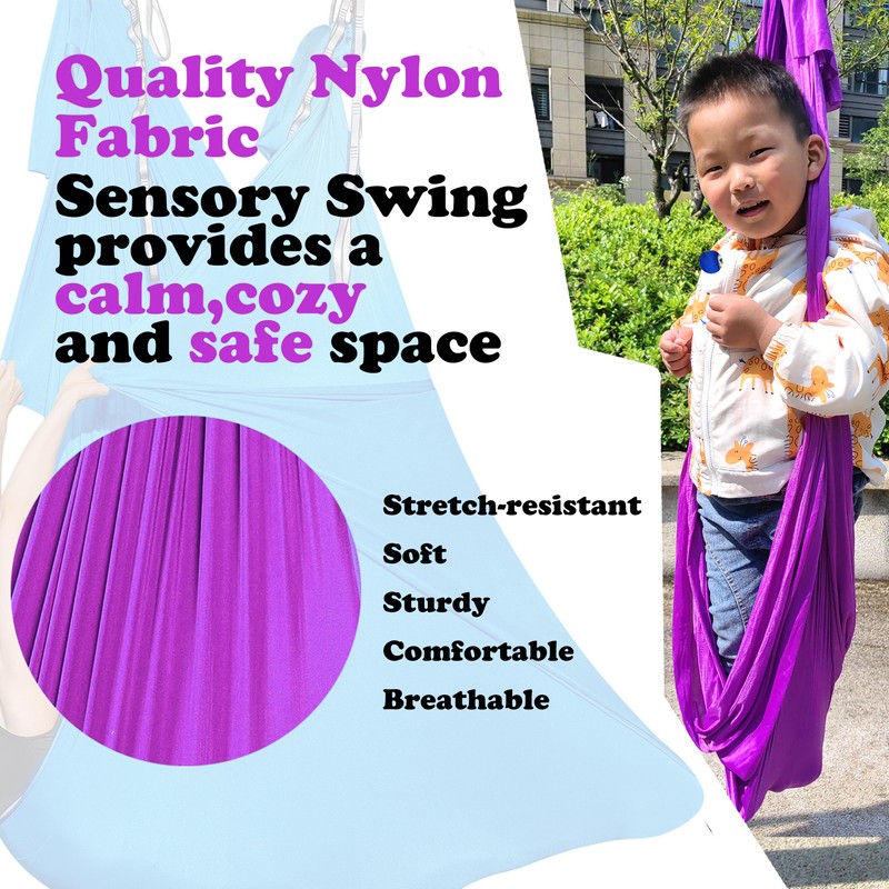 - Super Soft Fabric:Therapy sensory swings hammock for kids and adults sensory swing is made of 100% lightweight, breathable nylon fabric. Hold up to 160 lbs, and tear-resistant and great elasticity, fully reversible and washable. Fabric measures 59 IN X110 IN when laid flat.