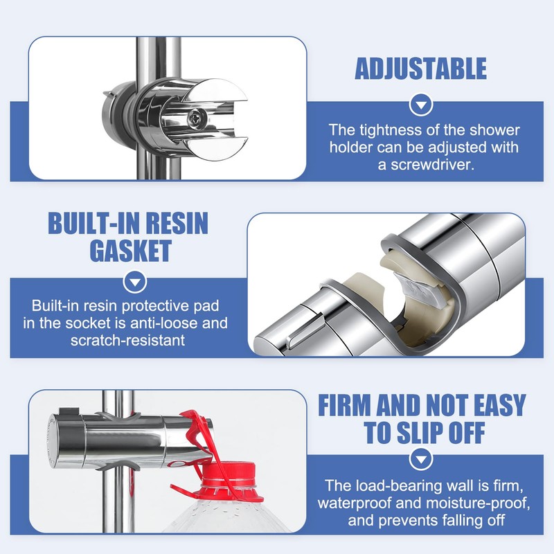 - Quick and Easy Installation:Forget about complicated installations and tools—this shower head holder replacement is designed for easy setup. Simply adjust the knob to the correct size, slide it onto your shower riser rail slider, and the holder is ready to use. There’s no need to disassemble the shower pole holder, and the tool-free installation saves you both time and effort. It’s the simplest way to upgrade or replace your shower head holder chrome.