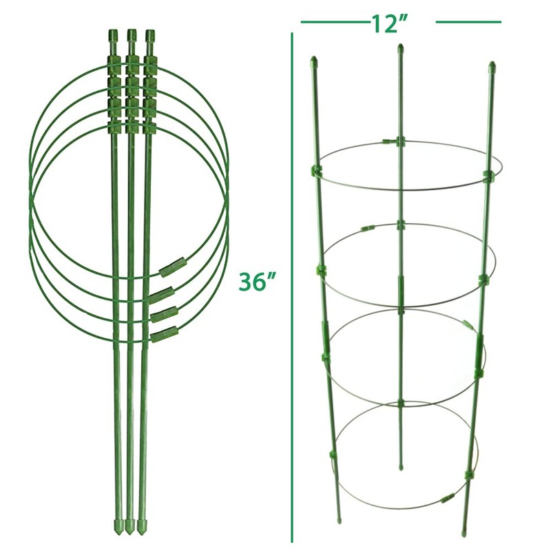 - 🌑[Rustproof and Durable] Tomato and Plant support cage both the stakes and rings are made of metal material and wrapped in a high-quality plastic coating. Flexible plastic connectors. That make it rust-proof, the heat dissipation is good, does not hinder plant growth and entanglement, durable to use.