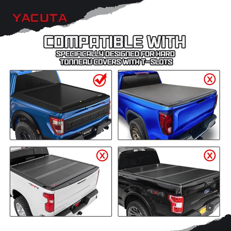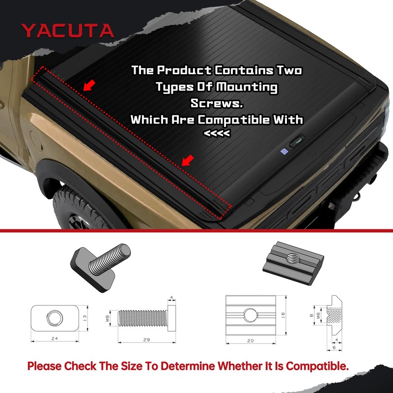 - 【Tonneau Cover Compatible】Specifically designed for Retractable Truck Bed Tonneau Cover with T-slots,will not affect closing and opening.Equipped with two types of T-slot nuts and bolts for installation,please check the size to determine whether it is compatible.Note:It is not compatible with retractable tonneau covers without T-slots .