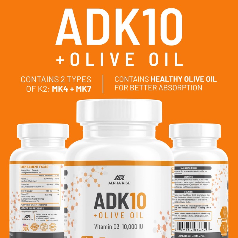This Vitamin ADK10 supplement combines 10,000 iu of Vitamin D3 with Vitamin K2 (MK7 & MK4) plus Vitamin A 5,000 iu. If you’re looking for a high potency premium product that won’t break the bank then there’s none better than Alpha Rise’s Vitamin ADK 10. It's been specifically formulated by nutrition professionals to support strong bones, skin, muscles and the all important immune system.