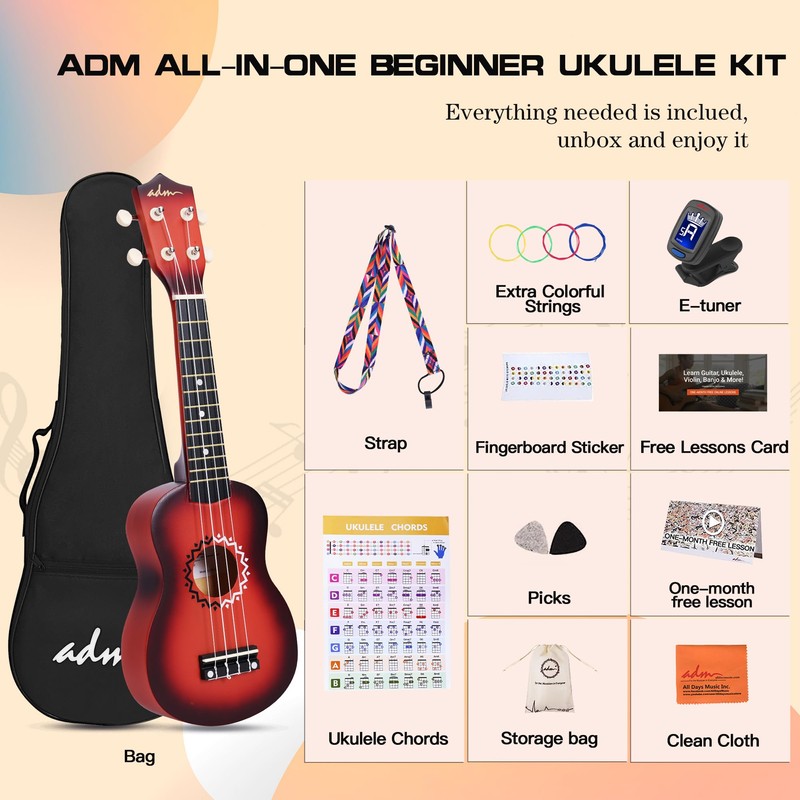 - ♫【GREAT GIFT FOR BEGINNERS】Save your hand and earned money on costly lessons, our ADM soprano ukulele together with the beginners pack is the best choice for adults or kids who are just getting started with Ukulele. Great for birthdays, Christmas, Children’s Day, housewarming, graduation gifts and much more. Now you can teach yourself the ukulele, thanks to our all-inclusive beginner's kit