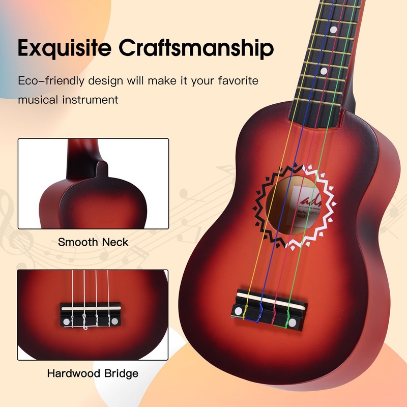 - ♫【SUPERIOR-QUALITY CRAFTSMANSHIP】ADM Soprano 21" ukulele are made of high-quality solid basswood which offers a bright and distinctive tone whether you solo, play along or singing with friends. Highly polished smooth nylon strings with elevated resistance to wear under tension and the eco-friendly design make it your favorite musical instrument