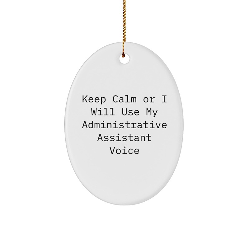 • Make a statement with this 'Keep Calm Or I Will Use My Administrative Assistant Voice' Oval Ornament, perfect for any Administrative Assistant looking to add a touch of humor and professionalism to their office or home decor.