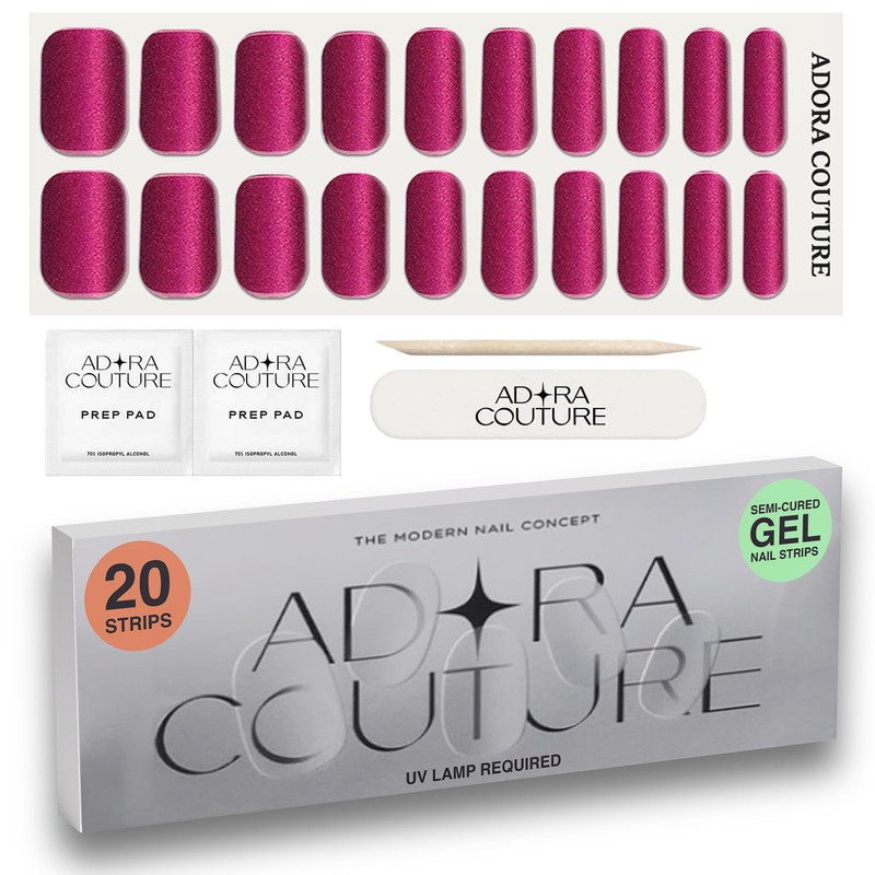Adora Couture Semi Cured Gel Nail Strips with 20 Pieces, Salon Quality Wraps for Women, Beautiful Deep Pink UV Gel Stickers, UV Light Required, Brilliant Berry