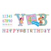 - Features ""Happy Birthday"" spelled out in pink, orange and teal