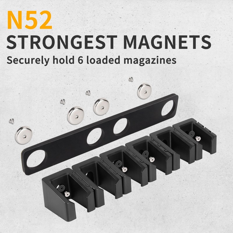 Magnets have ideal strength to securely hold 6 loaded magazines.