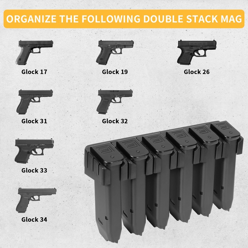 - HOLDS DOUBLE STACK MAG VERY SNUGGLY - Hundreds of fit tests by product engineers for the magnetic pistol wall mount are an excellent solution for organizing and displaying your handgun mags. Fits Glock 17 19 26 31 32 33 34 snug and lines up perfectly.